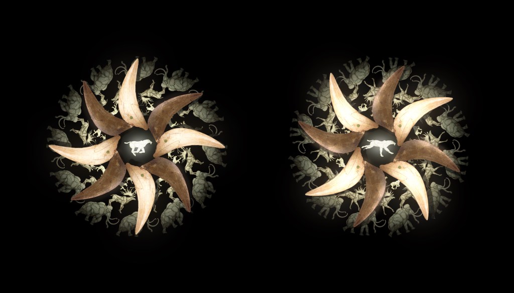 Casts of Homotherium canine teeth (Torquay Museum). Paper cut-out mammoth, giant deer, cave lion and hyaena by Sean Harris