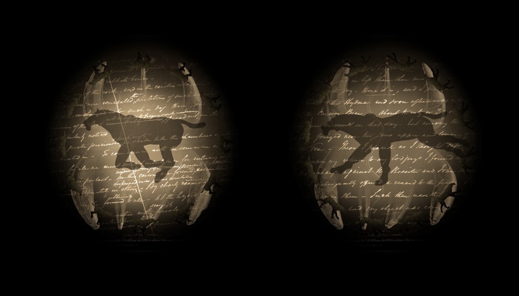 Pages from Father John MacEnery’s script for Cavern Researches and lithograph of Ursus cultridens teeth by Mary Buckland (Torquay Museum). Paper cut-out Homotherium by Sean Harris.