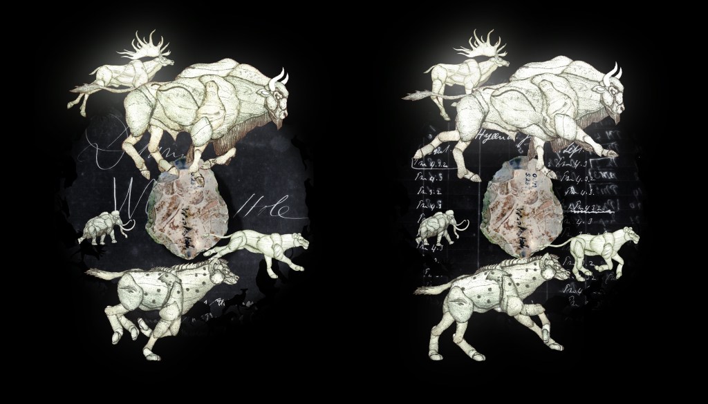 Pages from William Boyd Dawkins journal from the excavation of the Hyaena Den, Wookey Hole and replica hand axe (Wells and Mendip Museum). Paper cut-out giant deer, steppe bison, mammoth, cave lion and hyaena by Sean Harris